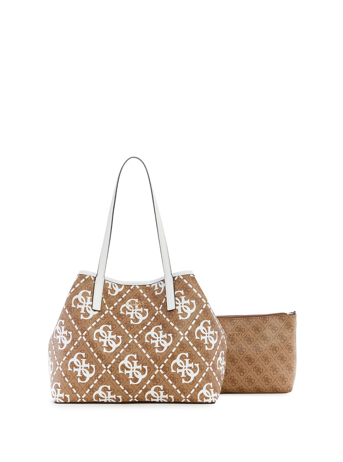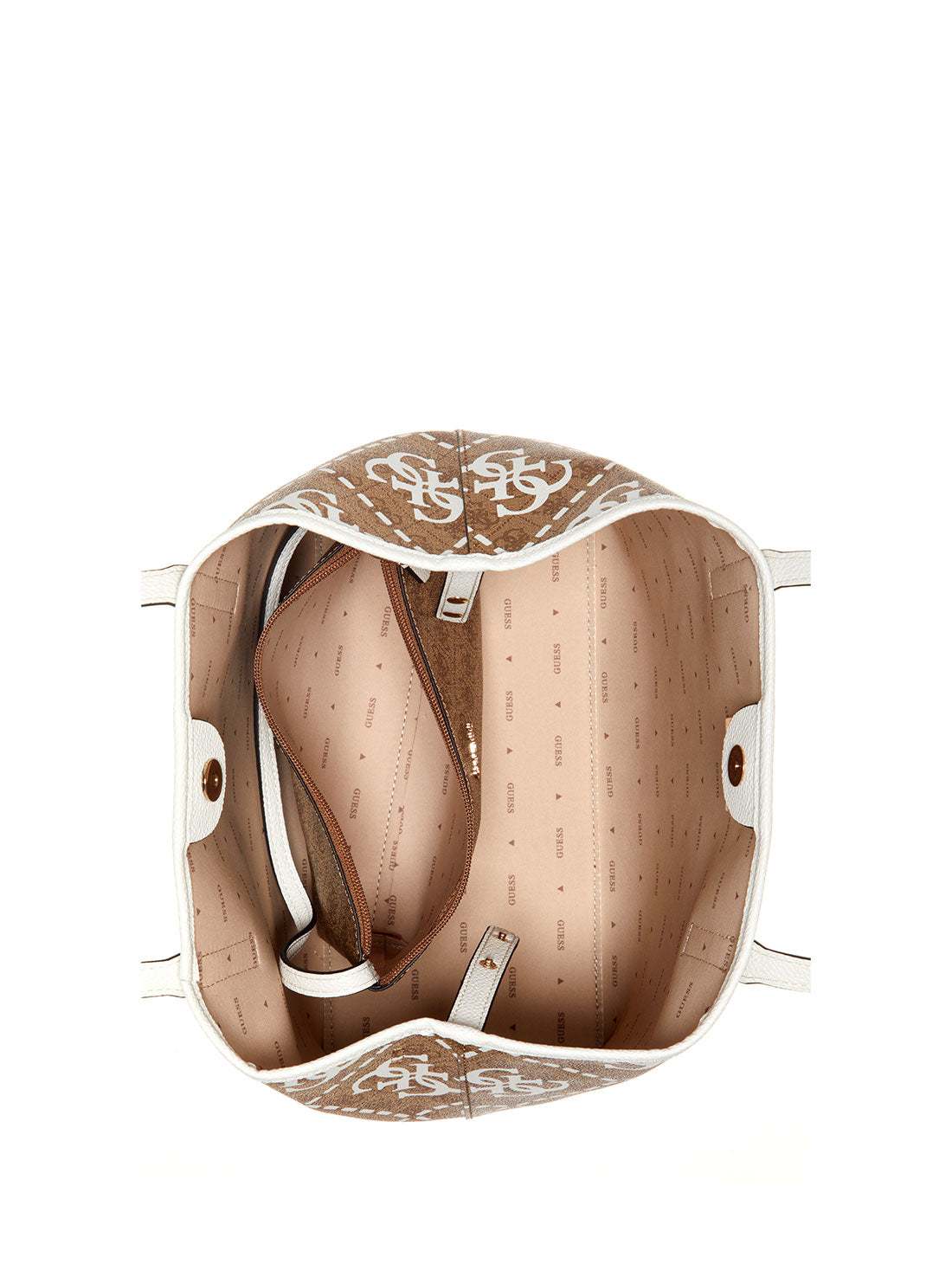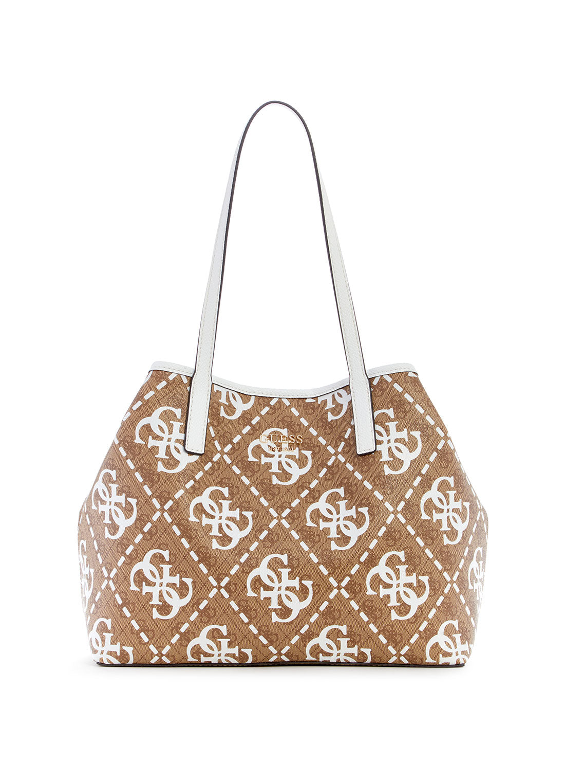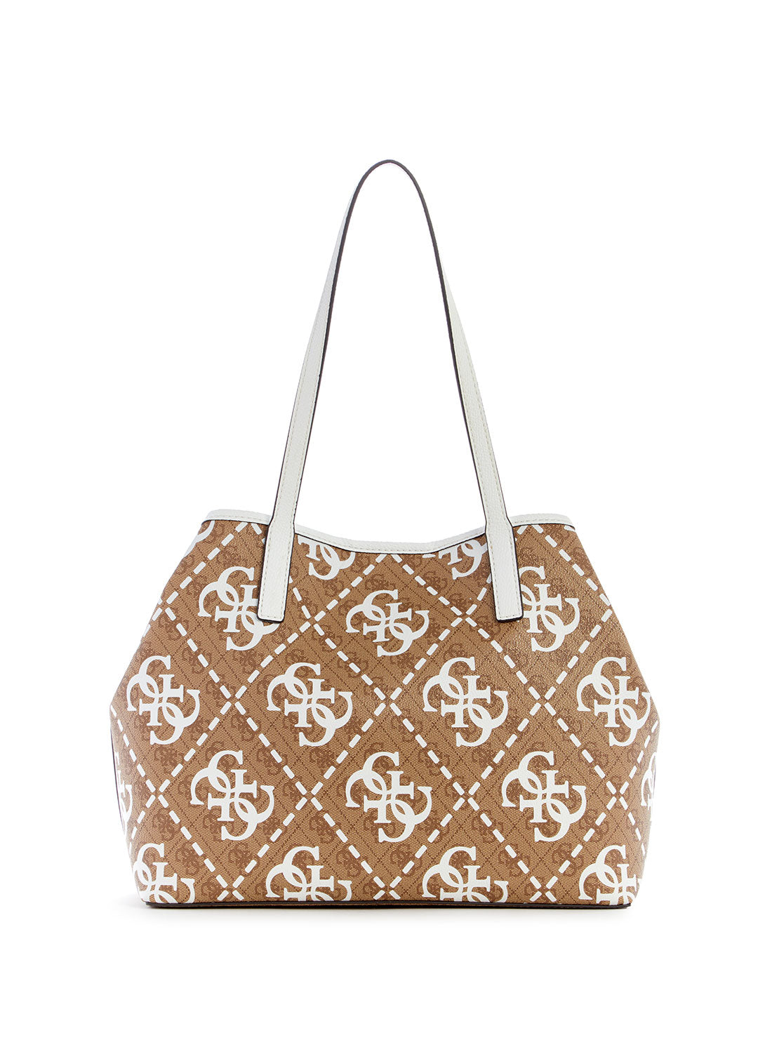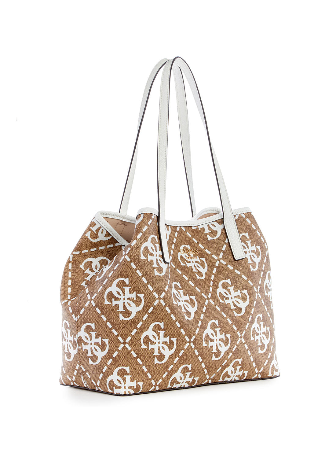 GUESS Women's Latte White Logo Vikky Tote Bag OQ699523 Front View GUESS Women's Latte White Logo Vikky Tote Bag OQ699523 Full View GUESS Women's Latte White Logo Vikky Tote Bag OQ699523 Angle View GUESS Women's Latte White Logo Vikky Tote Bag OQ699523 Inside View GUESS Women's Latte White Logo Vikky Tote Bag OQ699523 Back View