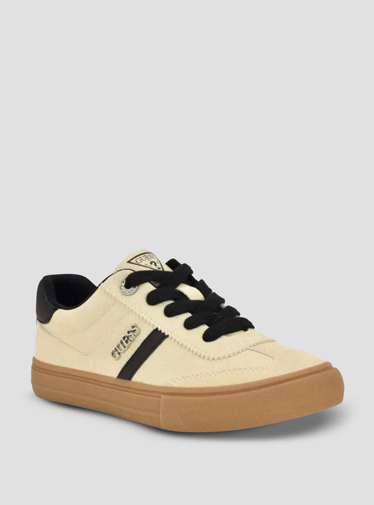 Add laid-back street style to your everyday wardrobe with the Beige Loui Sneakers. Crafted with soft suede and faux-leather panels, this low-top design features contrast stripe detailing and a subtle GUESS logo for a clean, sporty finish. The classic lace-up silhouette and durable rubber sole deliver comfort and effortless casual style.