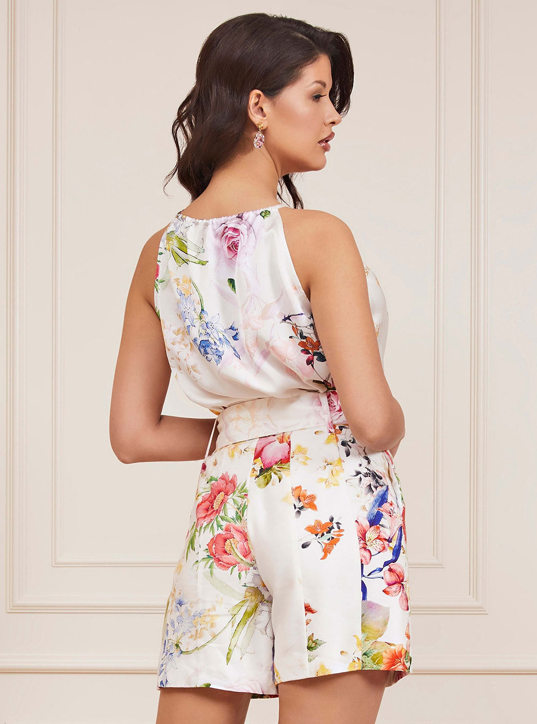 Chic and feminine, every woman needs our Marciano Glorious Garden Aster Top this season. Designed with an allover floral print, this top features a halter neckline, sleeveless cut, front tie detailing, front cut-out and a relaxed fit. Pair with a skirt or pants to complete your look.