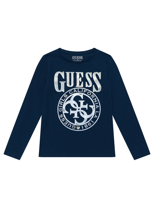 Get your little one rocking the latest fashion with this navy long sleeve t-shirt from GUESS Kids! Made with a soft and stretchy cotton blend, this top features a classic crew neckline and the iconic white GUESS logo. Perfect for both casual and dressy occasions.