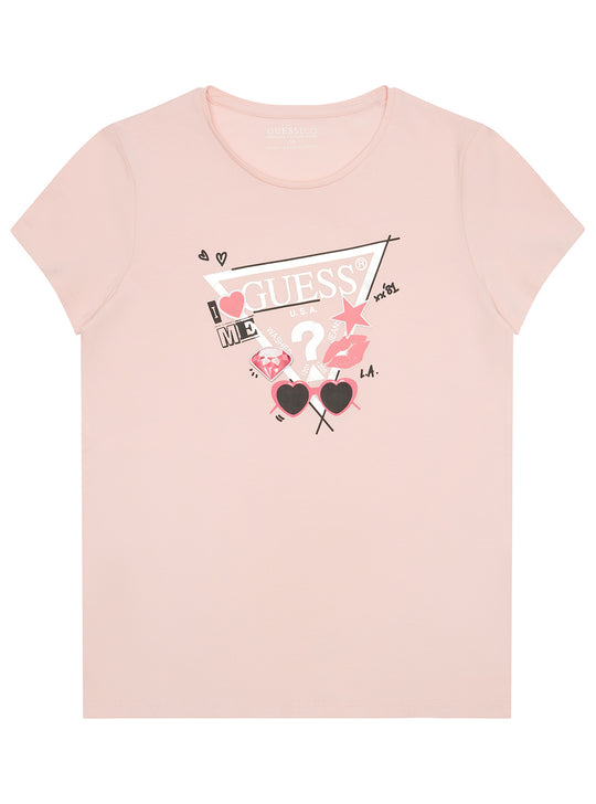 Brighten up her everyday wardrobe with this Pink Graphic T-Shirt (7–16). Featuring a playful triangle logo design with hearts, stars, and sunglasses, this tee adds a fun, feminine vibe to any casual look. Made from a soft and stretchy cotton blend for all-day comfort.