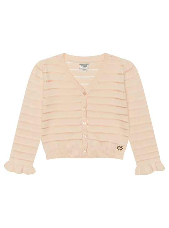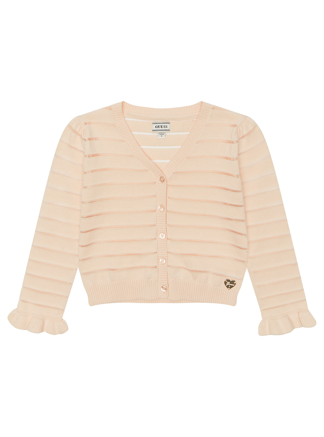Add some GUESS-tastic style to your little one's wardrobe with this pink long sleeve cardigan! Featuring a playful V neck and ruffle details on the long sleeve, this cardigan also has a noticeable logo detail and trendy all over stripes. Made of a comfortable and durable cotton-polyester blend, this cardigan is a must-have for any stylish kid.