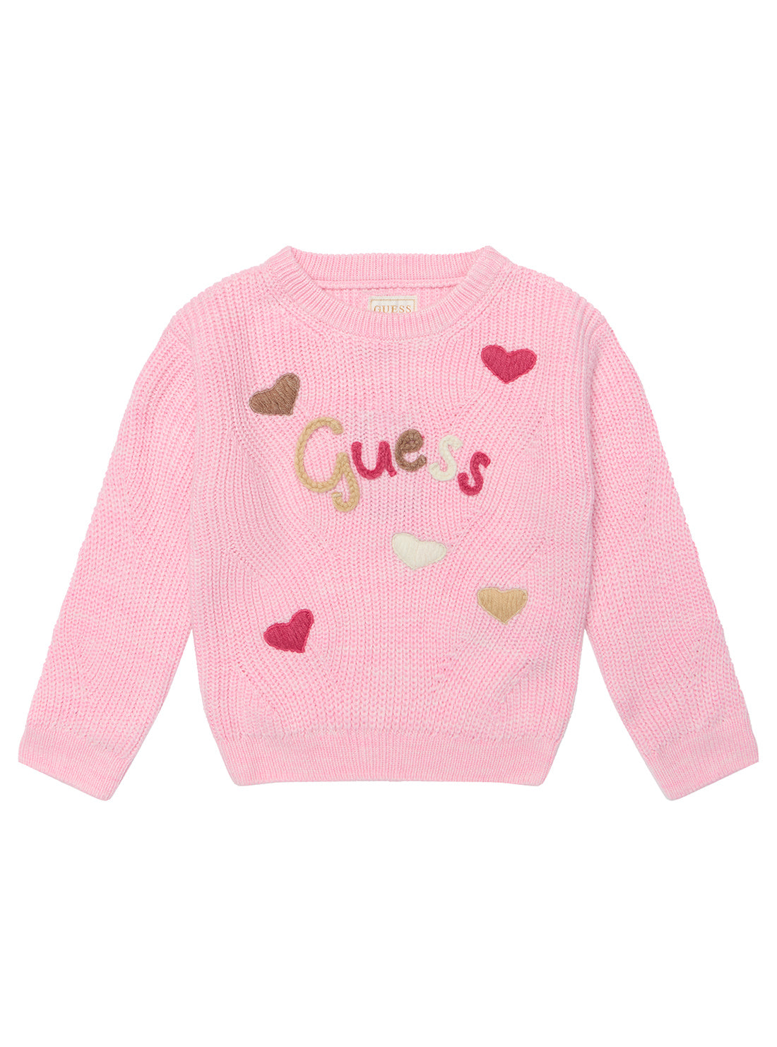 Add a touch of sweetness to her everyday wardrobe with the GUESS Long Sleeve Sweater. In a soft Ballet Pink hue, this cosy knit features contrasting embroidered hearts and a delicate GUESS logo in thread. Complete with a warm fleece lining, it’s perfect for layering on cooler days while keeping her stylish and snug.