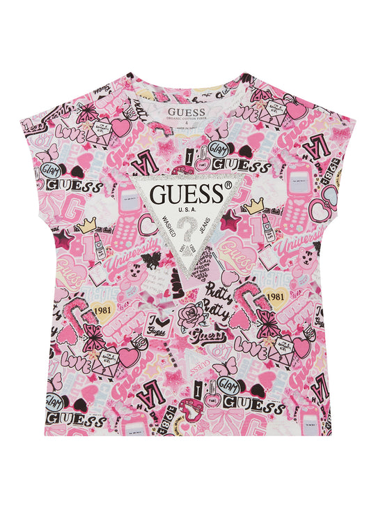 GUESS Kids Pink Multi Logo Short Sleeve T-Shirt (2-7) K5YI02K6YW4 Front View GUESS Kids Pink Multi Logo Short Sleeve T-Shirt (2-7) K5YI02K6YW4 Back View