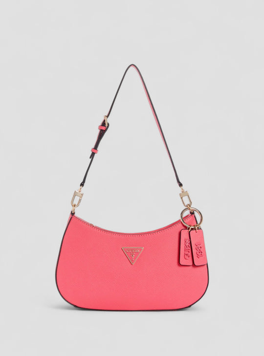 Add a pop of colour to your look this season with our Magenta Noelle Shoulder Bag. Crafted from a saffiano PU base, this handbag features shiny gold hardware, GUESS logo detailing, an adjustable shoulder strap, zip closures and internal compartments. Perfect for accessorising as a statement piece!