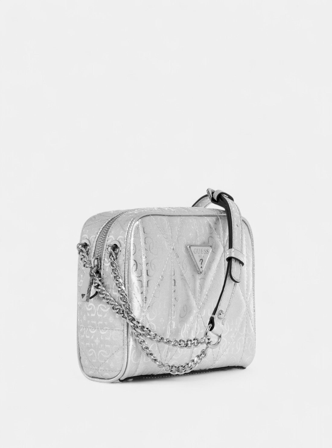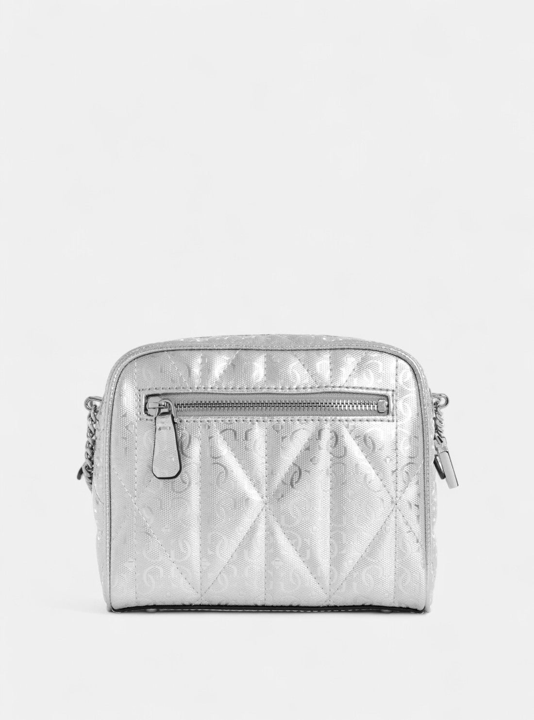 Keep your essentials close in style with the Silver Logo Aldina Camera Crossbody Bag. Designed with a sleek silhouette and sleek metallic quilted G-shine finish, this bag is perfect for casual outings or day-to-night wear. The zip-around closure and back zipper pocket offer easy access and secure storage, while the chain and leatherette strap adds a chic, modern edge to your look.