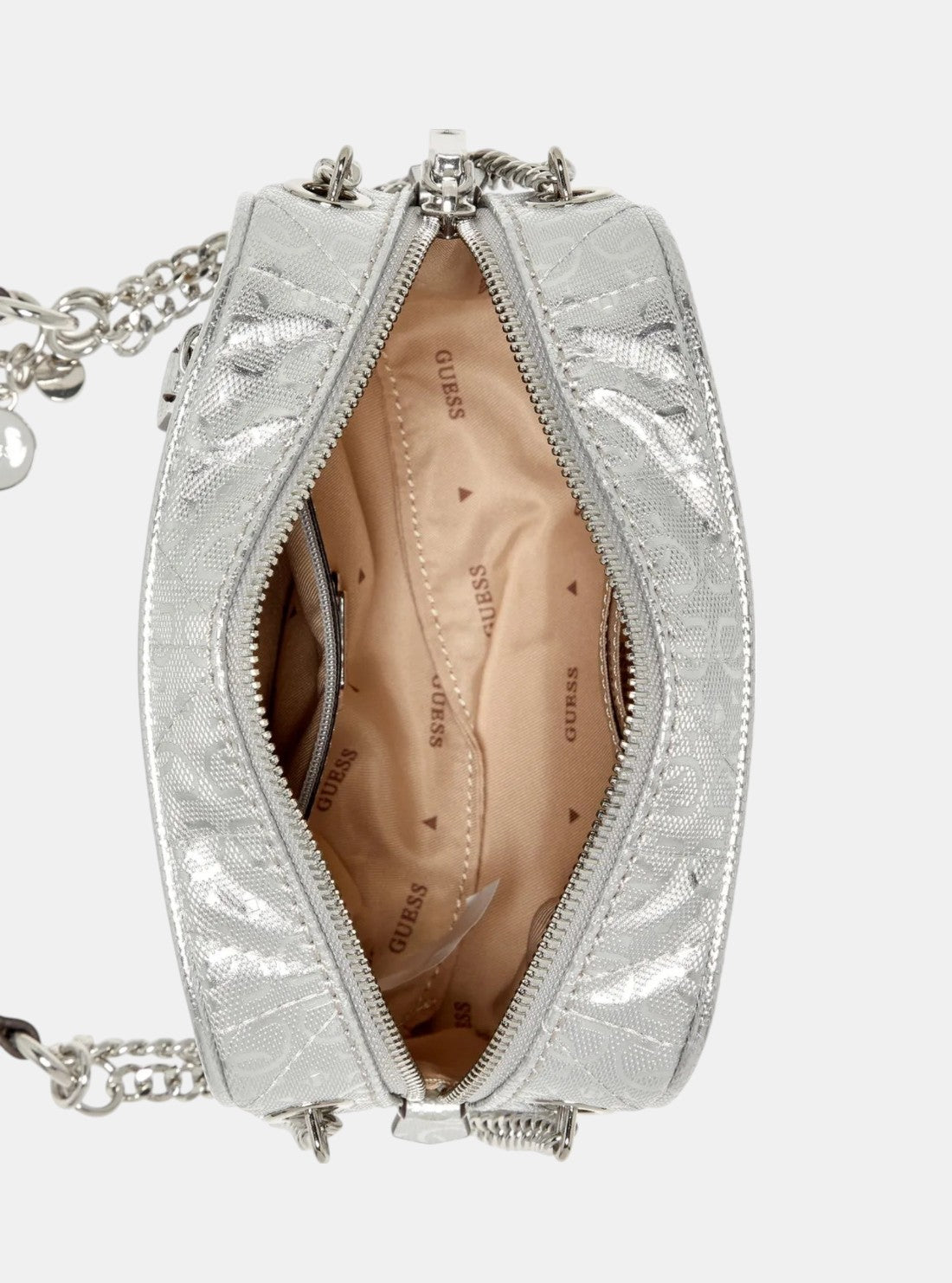 GUESS Womens Silver Aldina Camera Crossbody Bag GY966314SIL Front View GUESS Womens Silver Aldina Camera Crossbody Bag GY966314SIL Front Side VIew GUESS Womens Silver Aldina Camera Crossbody Bag GY966314SIL Inside View GUESS Womens Silver Aldina Camera Crossbody Bag GY966314SIL Back View