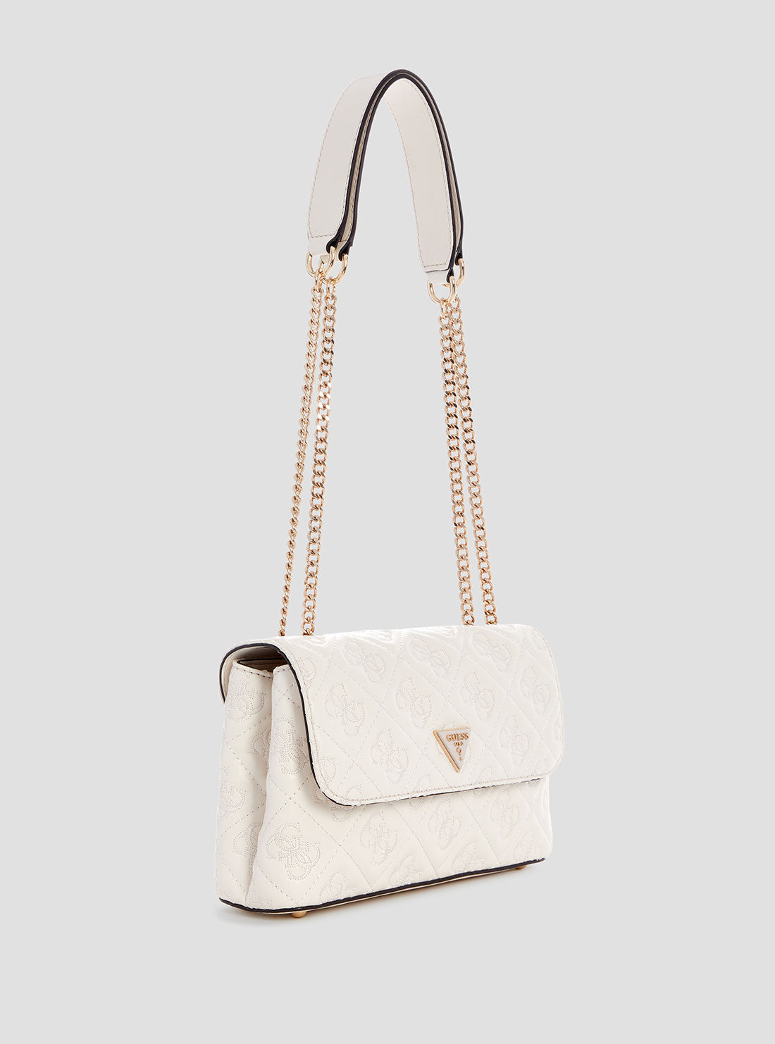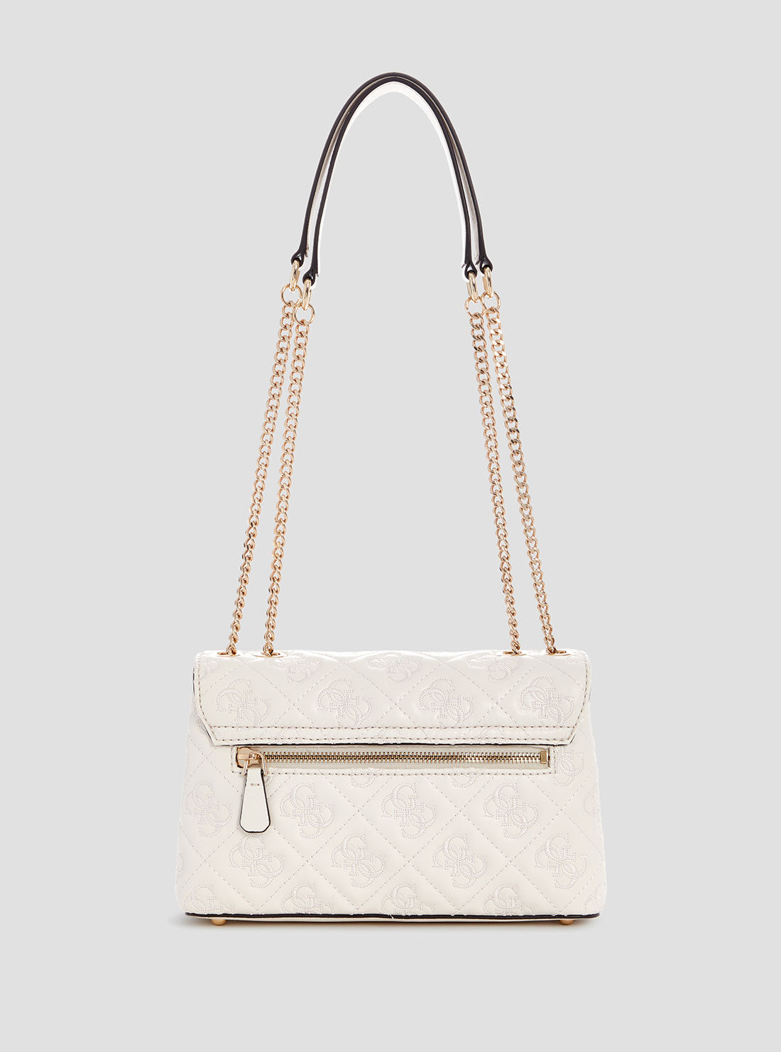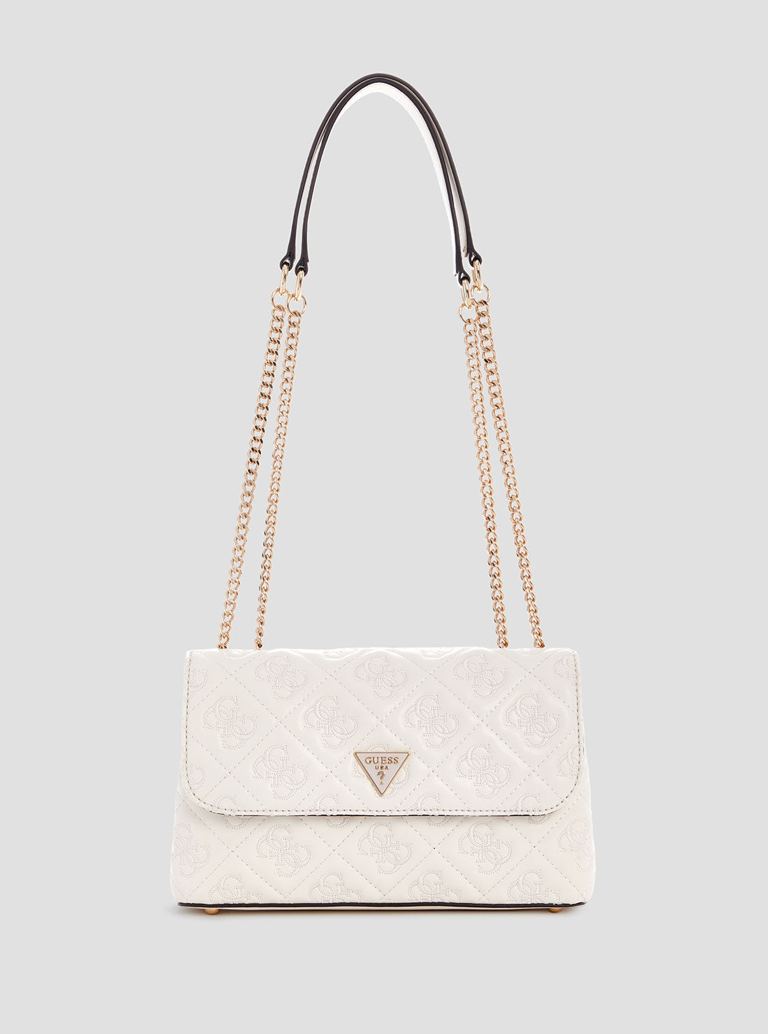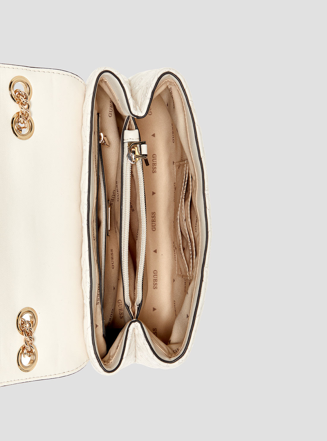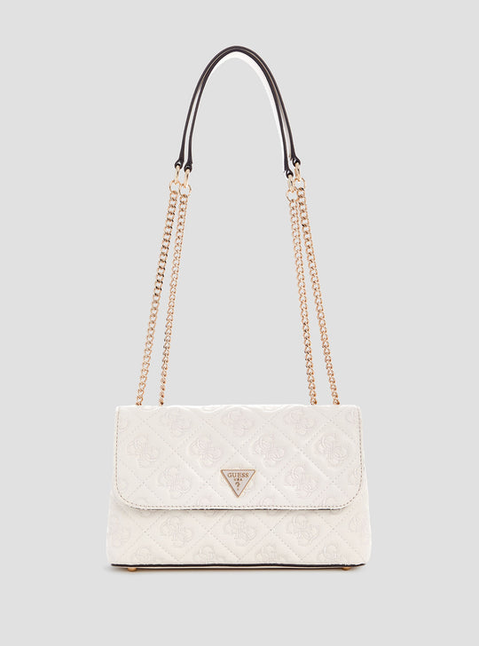Go from shoulder to crossbody with the GUESS Women's White Adelasia Convertible Bag. Perfect for your daily essentials, the half flap closure and outer zip pocket make this bag functional and stylish. The base and trim are crafted materials, while the shiny gold hardware adds a touch of luxury.