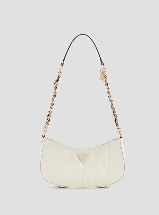 Chic and compact, the White Logo Aldina Top Zip Shoulder Bag is the perfect finishing touch to your day-to-night ensemble. Featuring a sleek silhouette with a quilted G-shine finish, signature triangle logo detail and a bold chain handle, this bag delivers effortless sophistication with practical storage inside.