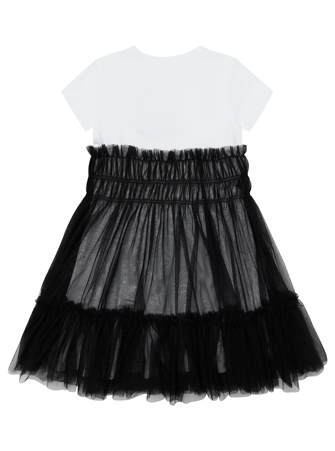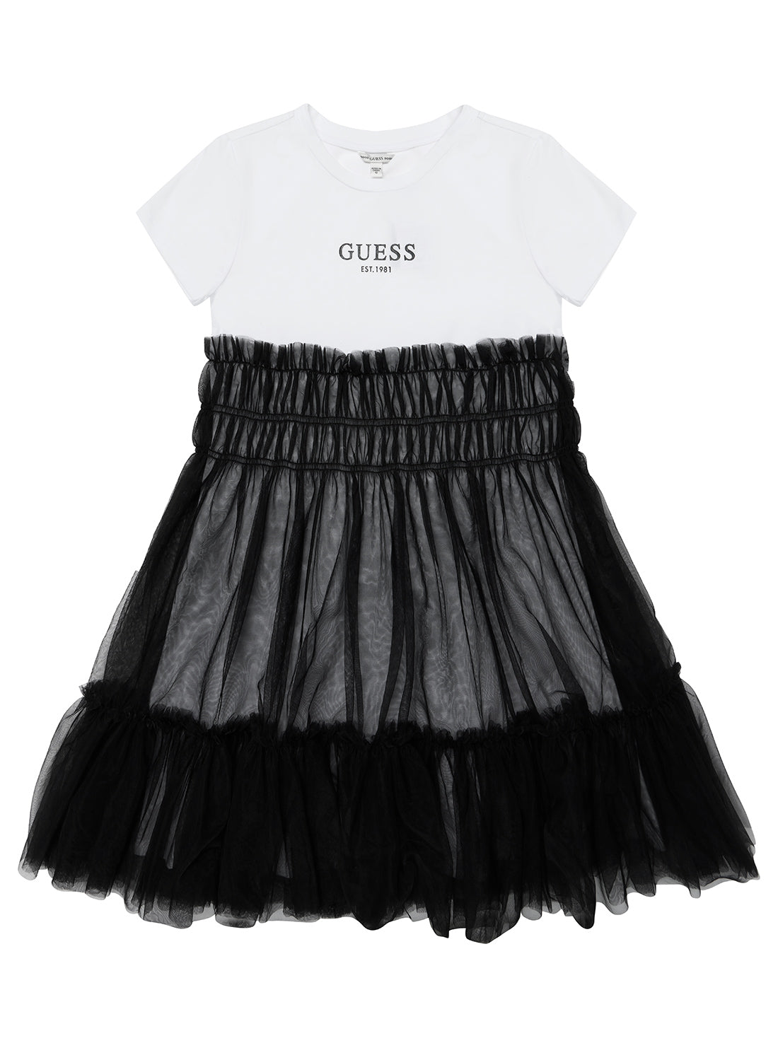 Let her twirl in style with the GUESS White and Black Short Sleeve Dress. Designed in a soft cotton blend, this fit-and-flare dress features a comfortable crew neckline, short sleeves, and a subtle logo print. The standout tule skirt features layered ruffles which adds a playful volume and a touch of elegance—perfect for special occasions or everyday flair.