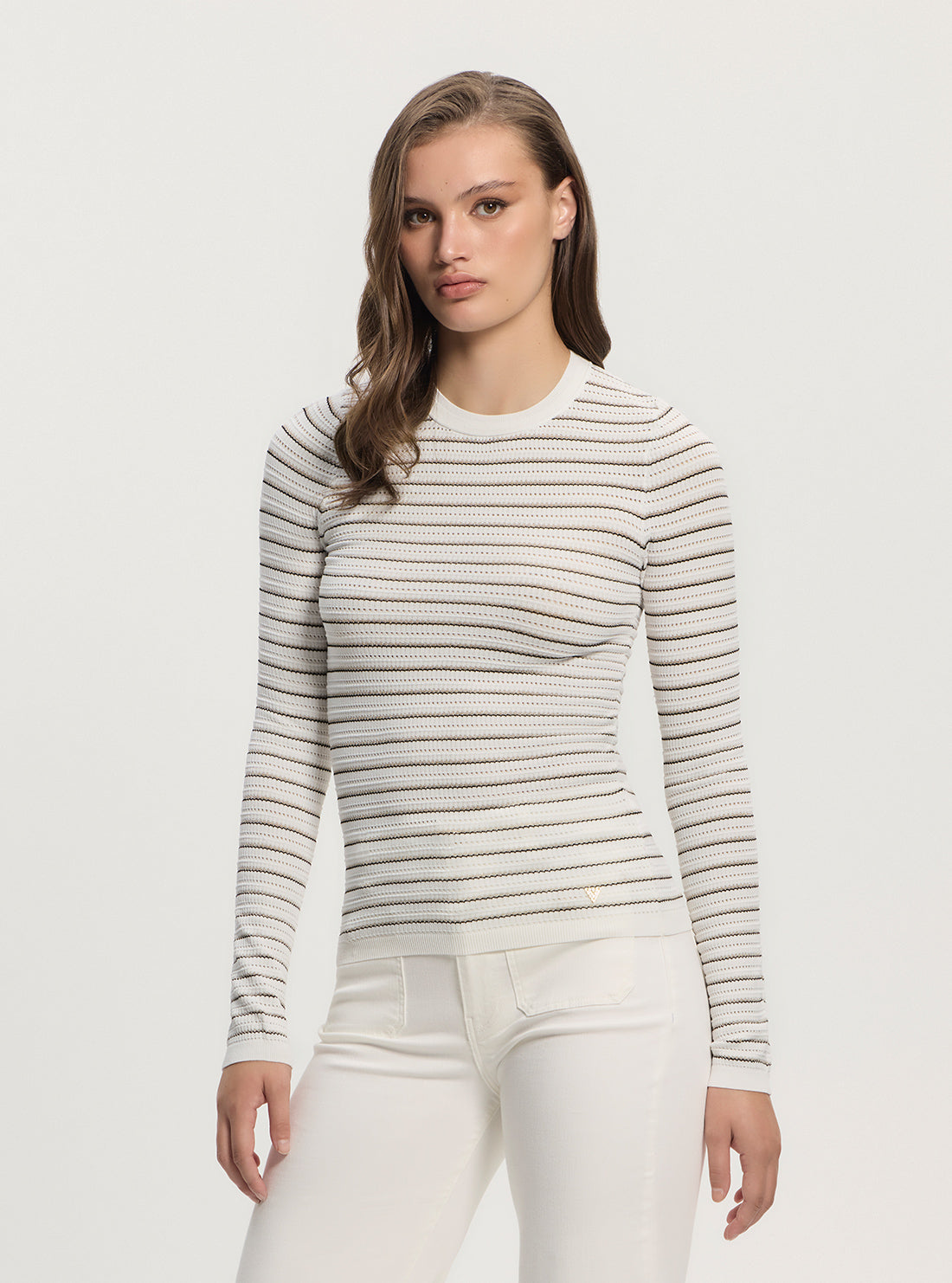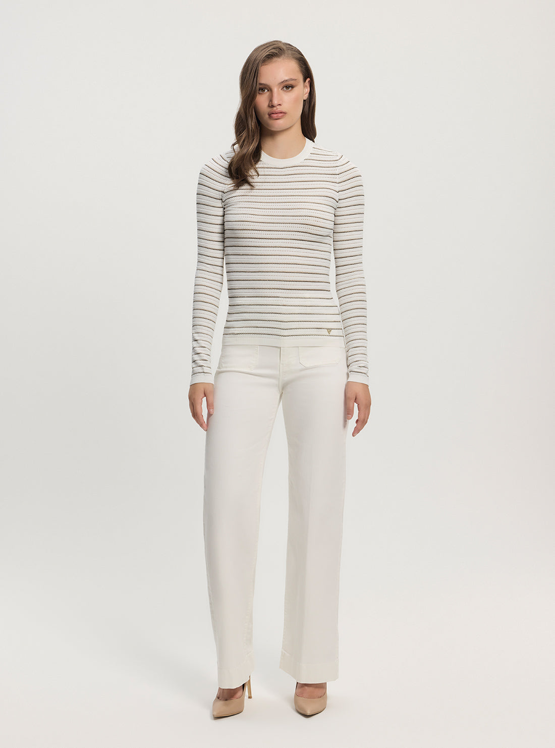 GUESS Womens White Black Striped Kyla Sweater W5GR14Z3MS0 Front View GUESS Womens White Black Striped Kyla Sweater W5GR14Z3MS0 Full View GUESS Womens White Black Striped Kyla Sweater W5GR14Z3MS0 Front Side View GUESS Womens White Black Striped Kyla Sweater W5GR14Z3MS0 Detail View GUESS Womens White Black Striped Kyla Sweater W5GR14Z3MS0 Back View