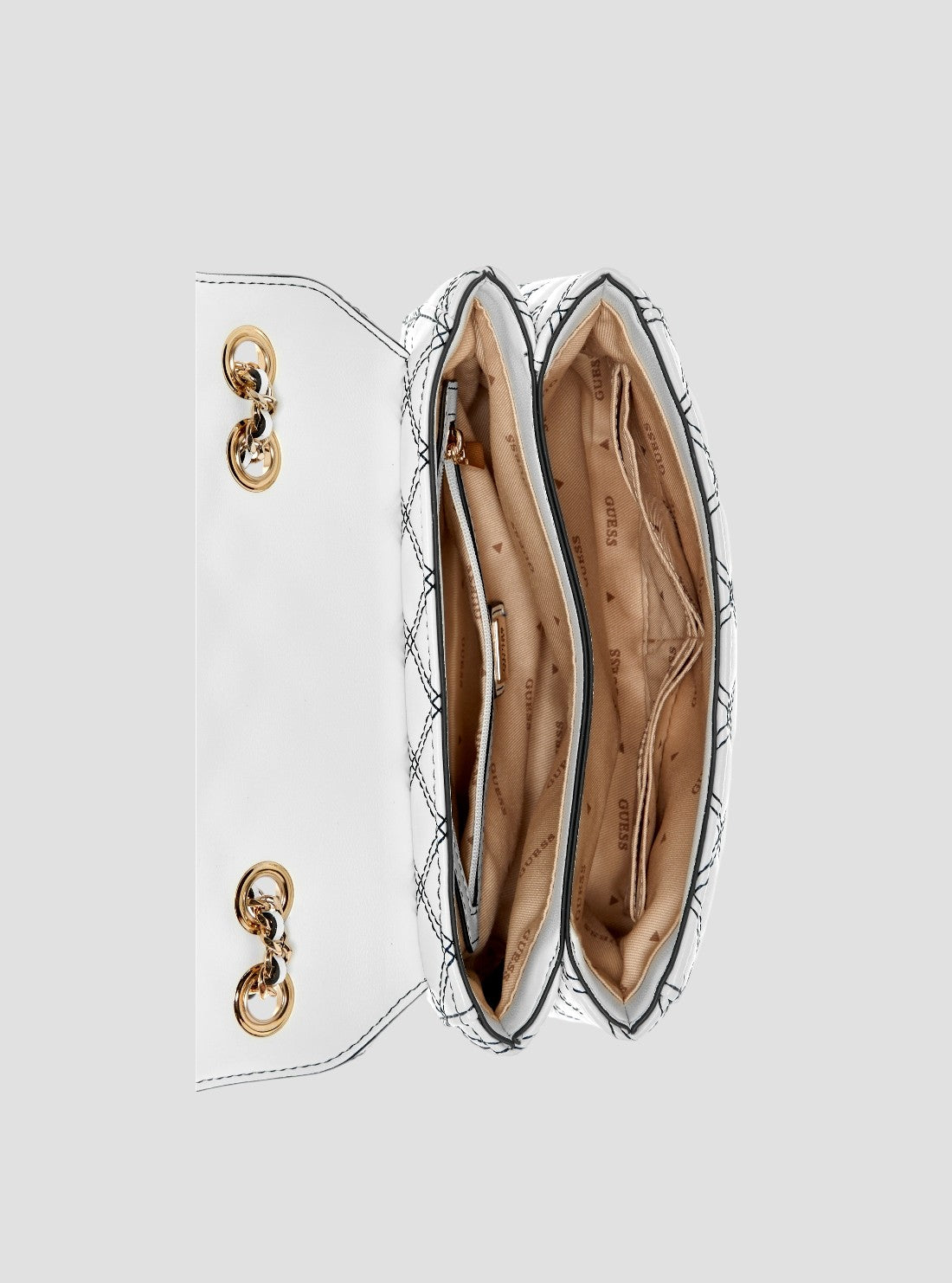 GUESS Womens White Cruise Vibe Convertible Crossbody Bag QG964920 Front View GUESS Womens White Cruise Vibe Convertible Crossbody Bag QG964920 Front Side View GUESS Womens White Cruise Vibe Convertible Crossbody Bag QG964920 Inside View GUESS Womens White Cruise Vibe Convertible Crossbody Bag QG964920 Back View