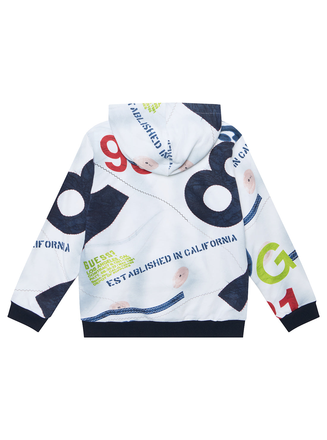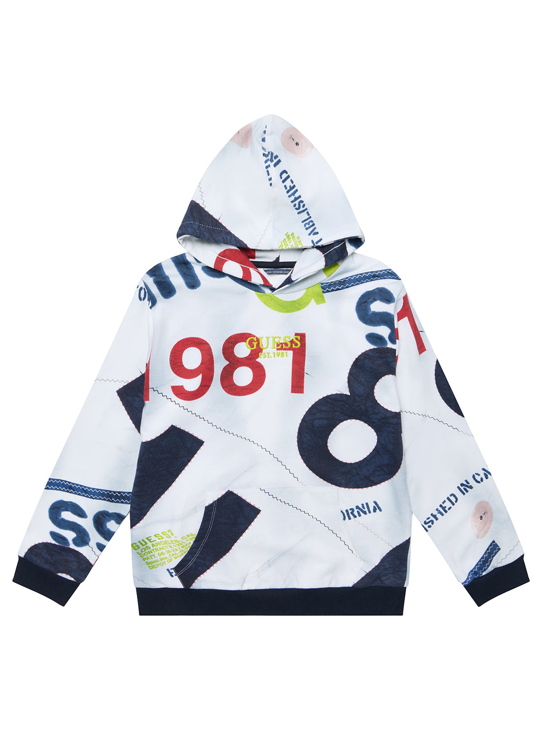 Step up their active game with this playful White Graphic Hooded Long Sleeve Top from GUESS Kids! Featuring a cosy hoodie and trendy all-over graphic print of the iconic GUESS logo, this top is perfect for any stylish and fun-loving kid. Made from 100% cotton for ultimate comfort during any activity.