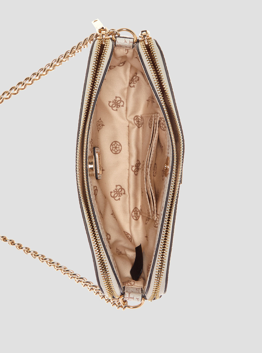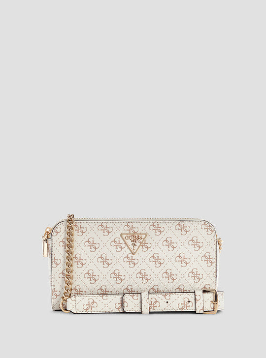 The White Logo Daryna Crossbody Bag is the perfect mix of style and convenience. Its top zip closure keeps all your essentials secure, while the chain crossbody strap allows for hands-free wear. The base Q logo PU and shiny gold hardware add a touch of glam. Upgrade your look with this quirky and fun bag.