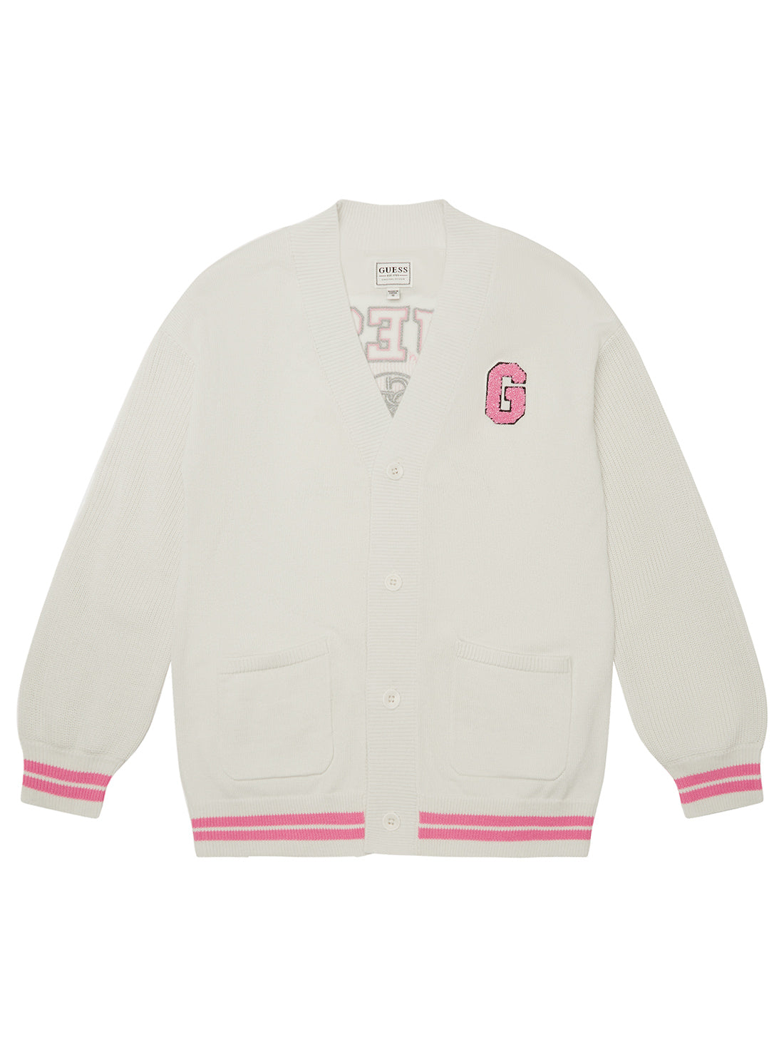 Add a preppy twist to her layering essentials with this White Long Sleeve Cardigan (7–16). Featuring varsity-inspired stripes and a chenille “G” patch at the chest, this button-up cardigan blends classic comfort with playful style. Made from a soft wool-acrylic blend, it’s perfect for tossing over tees or dresses on cooler days.