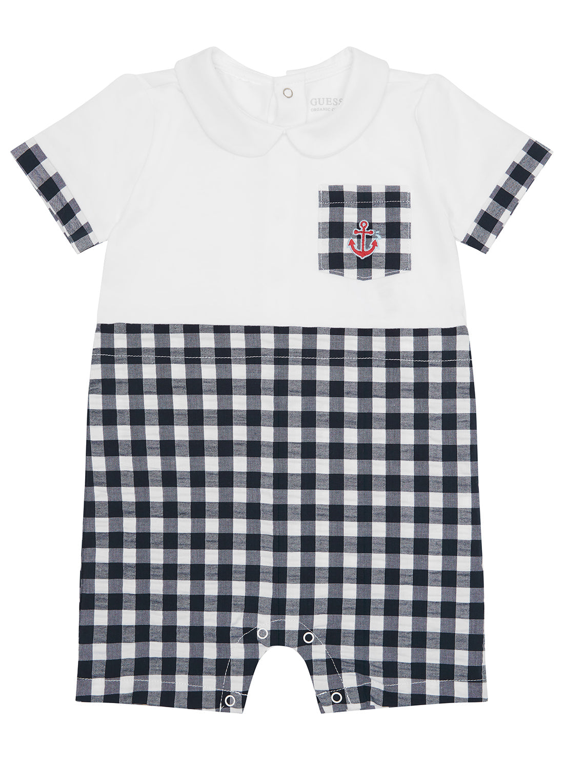 Dress your little one in timeless charm with the White Seersucker Shortie Romper (0-12m). Designed with a classic gingham pattern and contrasting collar, this adorable one-piece features a chest pocket with an embroidered anchor for a nautical twist. Made from a soft and stretchy cotton blend, it's perfect for playtime or special occasions.